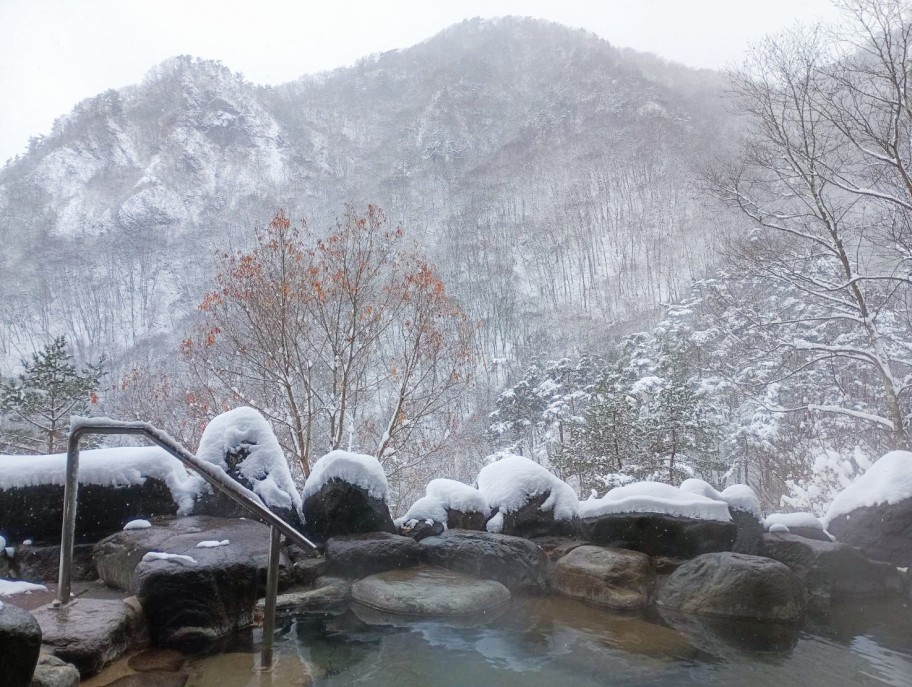 露天風呂から眺める雪に覆われた山々は、まさに息をのむような雄大さです。