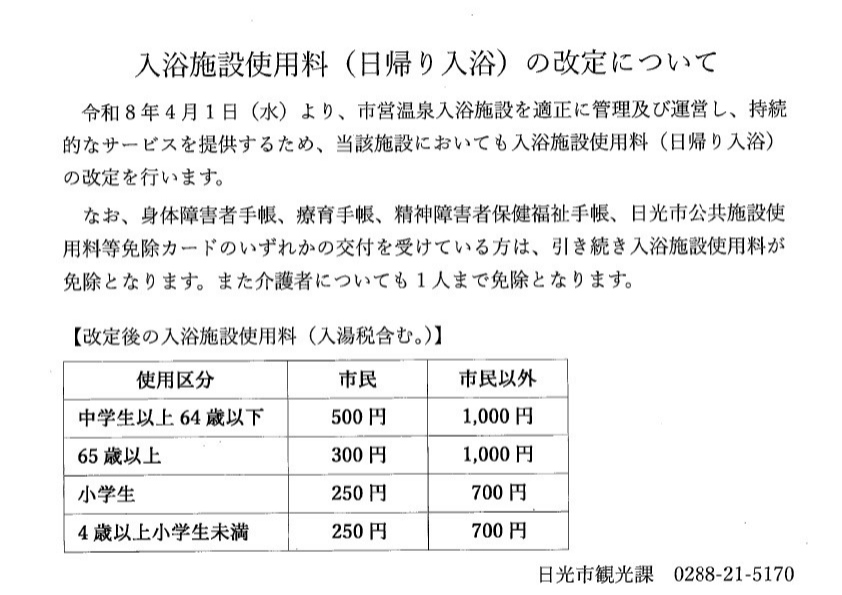 このたび、日光市より令和8年4月1日付で、入浴施設使用料(日帰り入浴)の改定について発表がございました。